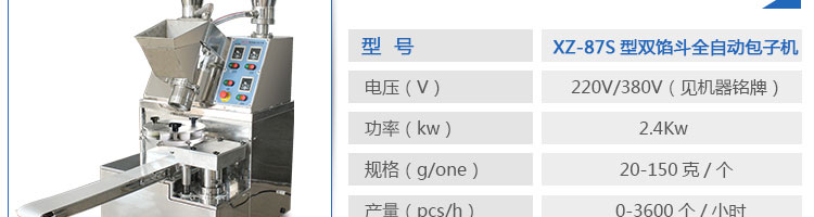 XZ-87S型双馅斗全自动小蝌蚪色版APP快播,可生产各种肉包、肉菜包、菜包、小笼包、汤包、水晶包、圆馒头、奶黄包、豆沙包、叉烧包、南瓜饼等几十种包馅制品。适用于宾馆、饭店、学校、机关企业食堂、馒头或包子加工厂、早餐工程店及速冻食品厂等单位。可满足不同客户群体。免费提供工艺技术。免费上门培训指导安装。