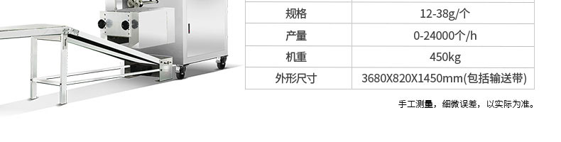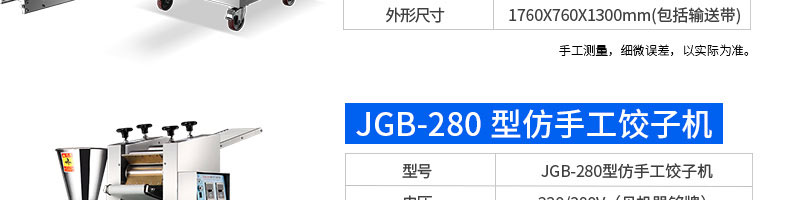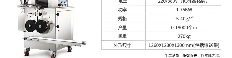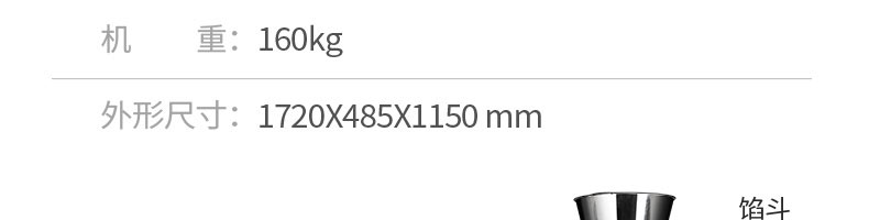 名称120-5A饺子机 电源220/380v 功率1.5kw 产量8100个/h 尺寸1720*485*1150mm 重量160kg 规格15-20g/个 其他
