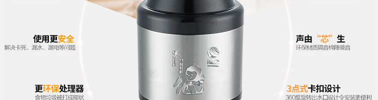 DCLQ40-厨房垃圾处理器,该机是一种现代化的厨房电器,它用全新的方法来处理现代家庭中的食品废物。处理器装于厨房水槽下,能够有效地将食物垃圾研磨成细小颗粒,直接从下水管道排出,从而轻松实现及时方便快捷的厨房清洁,优化家居环境。