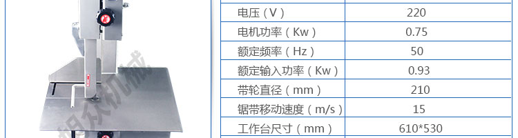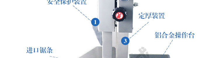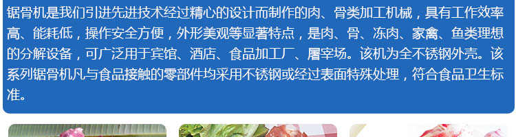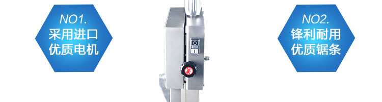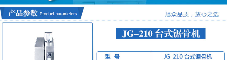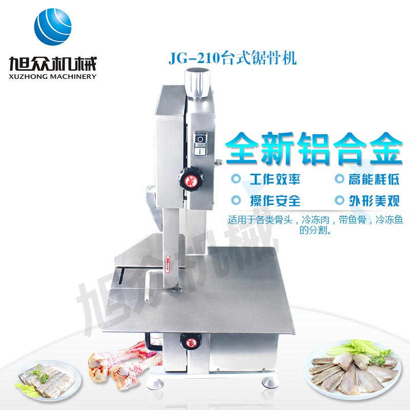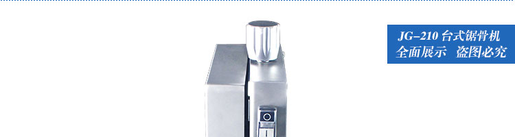 JG-210台式锯骨机,适用于各类骨头,冷冻肉,带鱼骨,冰块,冷冻鱼的分割。采用全不锈钢材料制作,具有工作效率高,操作安全的特点。广泛适用于食品加工厂,屠宰场,肉类加工厂等