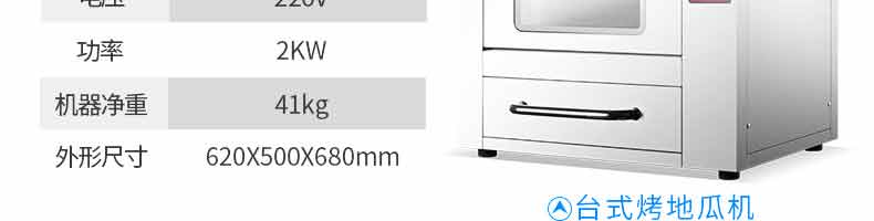 名称立式烤地瓜机 电源220V 功率3.2KW,2kw 产量 尺寸783*470*1280mm,620*500*680mm 重量70kg,41kg 规格 其他