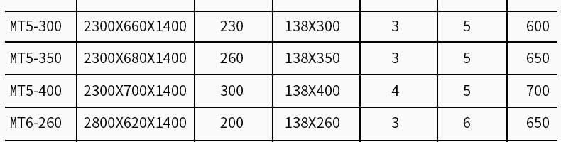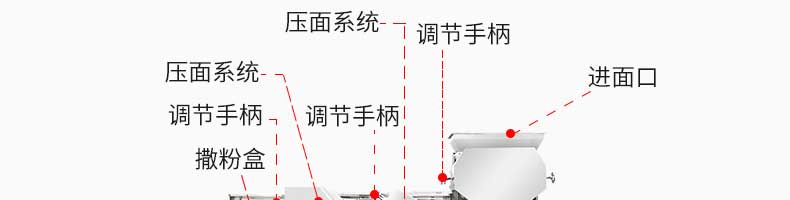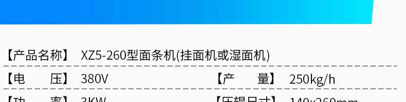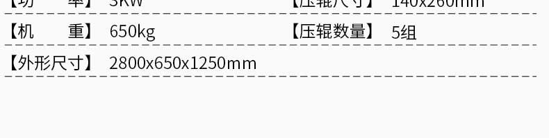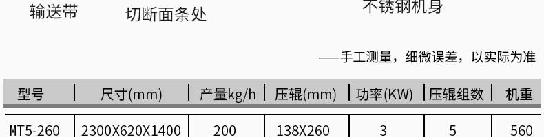名称MT5-260型面条机 电源380V 功率3KW 产量250kg/h 尺寸2800X650×1250mm 重量650kg 规格【压辊尺寸】140X260mr 其他【压辊数量】5组