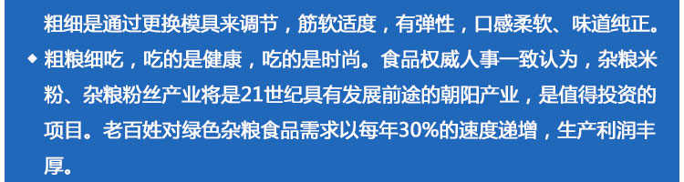 SZ-400多功能米粉机,生产多样性可生产米粉、米线、粉丝、粉条、、年糕、玉米面条、各种杂粮粉丝、各种面条、杂粮面条、彩色面条以及以红薯、玉米、大豆、蚕豆等制成淀粉为原料的等多种食品而且每种食品厚薄、粗细等规格可根据需要任意调整。