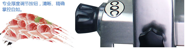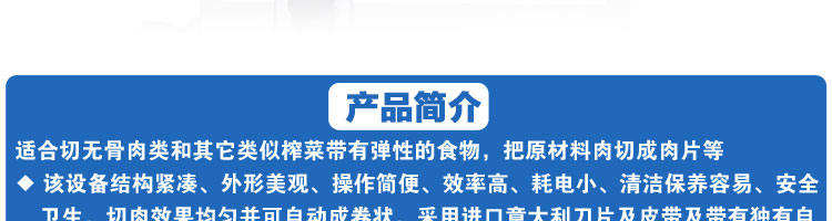 台式全自动切片机,适合切无骨肉类和其他类似榨菜带有弹性的食物,把原材料肉切成肉片,并可自动成卷状。可切牛肉片、羊肉片等