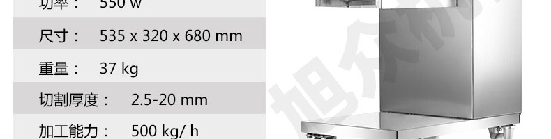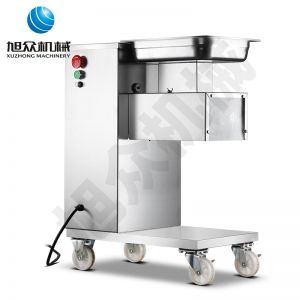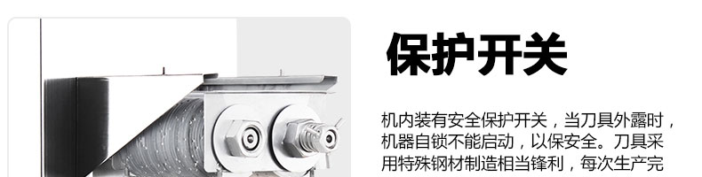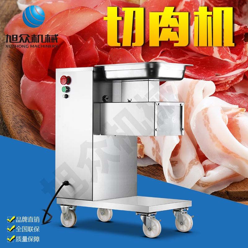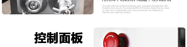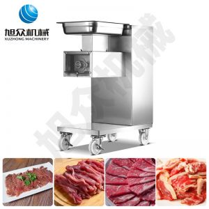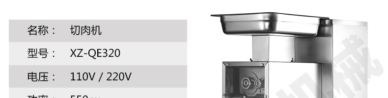 XZ-QE切肉机,是一款可方便移动的肉类加工设备,配置单层刀具一次性切肉片,二次切肉丝,再切成粒。底座设置有滑轮,移动灵活,轻松便捷;刀具采取外置悬臂式设计,拆洗方便,卫生更有保障;配置多种刀具,可加工不同厚度的肉片,实现一机多用;机内装有安全保护开头,刀具外露时,机器自锁不能启动,以保安全;刀片用特殊不锈钢材料制造,经久耐用;卸下的刀具,不用清洗直接放置在6摄氏度以下的冰箱里,刀具余肉不发臭。