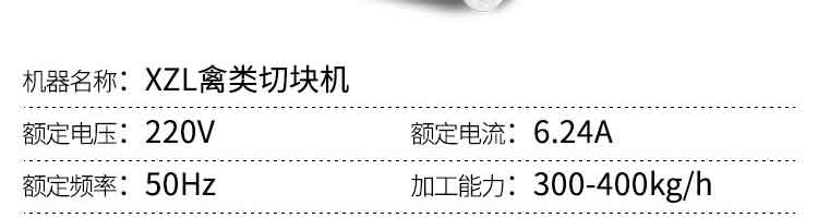 名称XZL禽类切块机 电源220V 功率1100W 产量300-400kg/H 尺寸 重量80kg 规格 其他