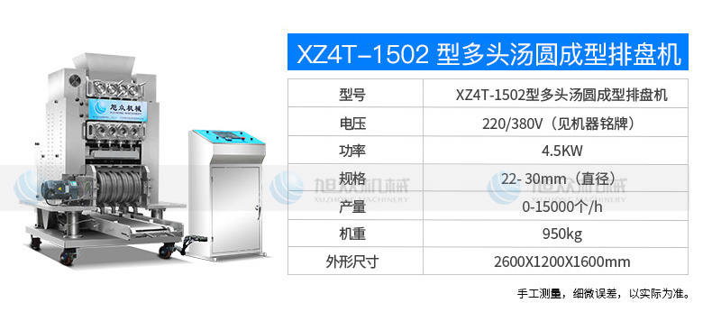 名称XZ4T -1502多头汤圆成型排盘机 电源220/380V(见机器铭牌) 功率4.5KW 产量0-15000个/h 尺寸2600x1200x1600mm 重量950kg 规格22-30mm(直径) 其他