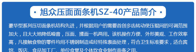 SZ40、SZ60压面面条机小蝌蚪吧视频黄色版,本机压面、揉面一机两用,用于制作面条、云吞皮、糕点、面点等食品,生产的产品韧性大、耐煮、不易断,适合于宾馆、饭店、食堂、面包厂及各类面点加工单位或个体商户使用。
