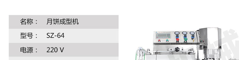 SZ-64月饼自动成型机,可同于制作各种月饼,适合印制各种月饼。适用于蛋糕房、休闲食品厂、食品加工产、面包房、月饼加工厂、超市、学校、食堂等各种工作场所。可满足不同客户群体。免费提供工艺技术。