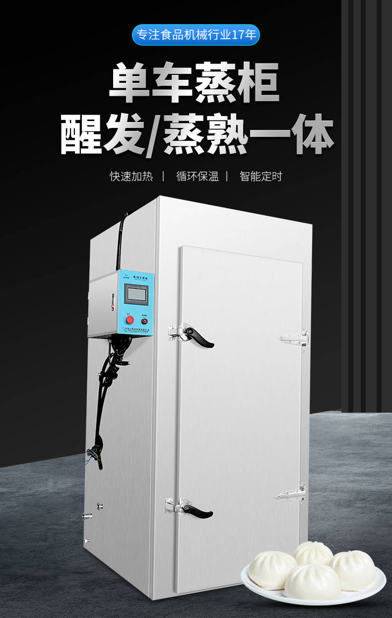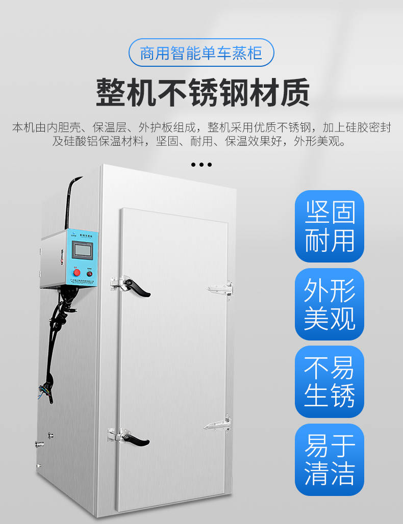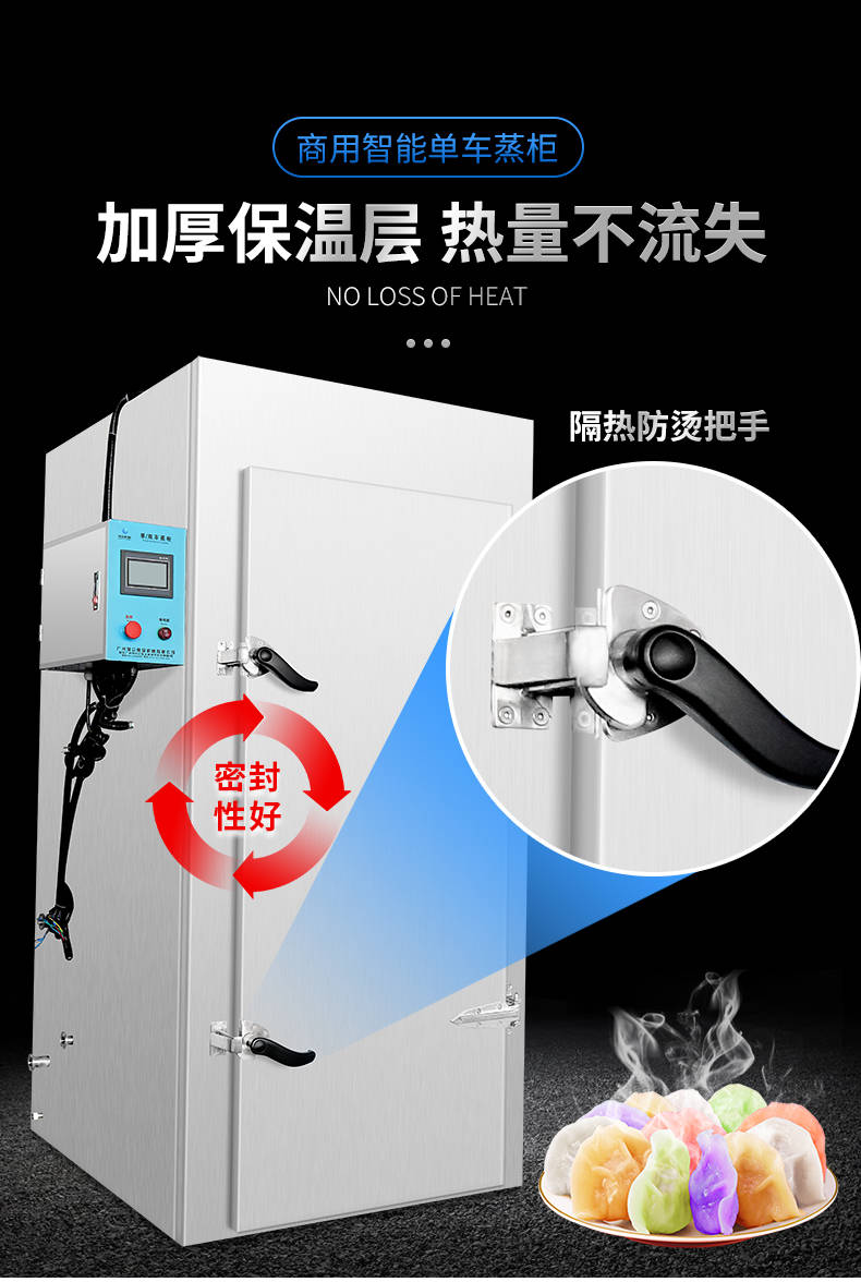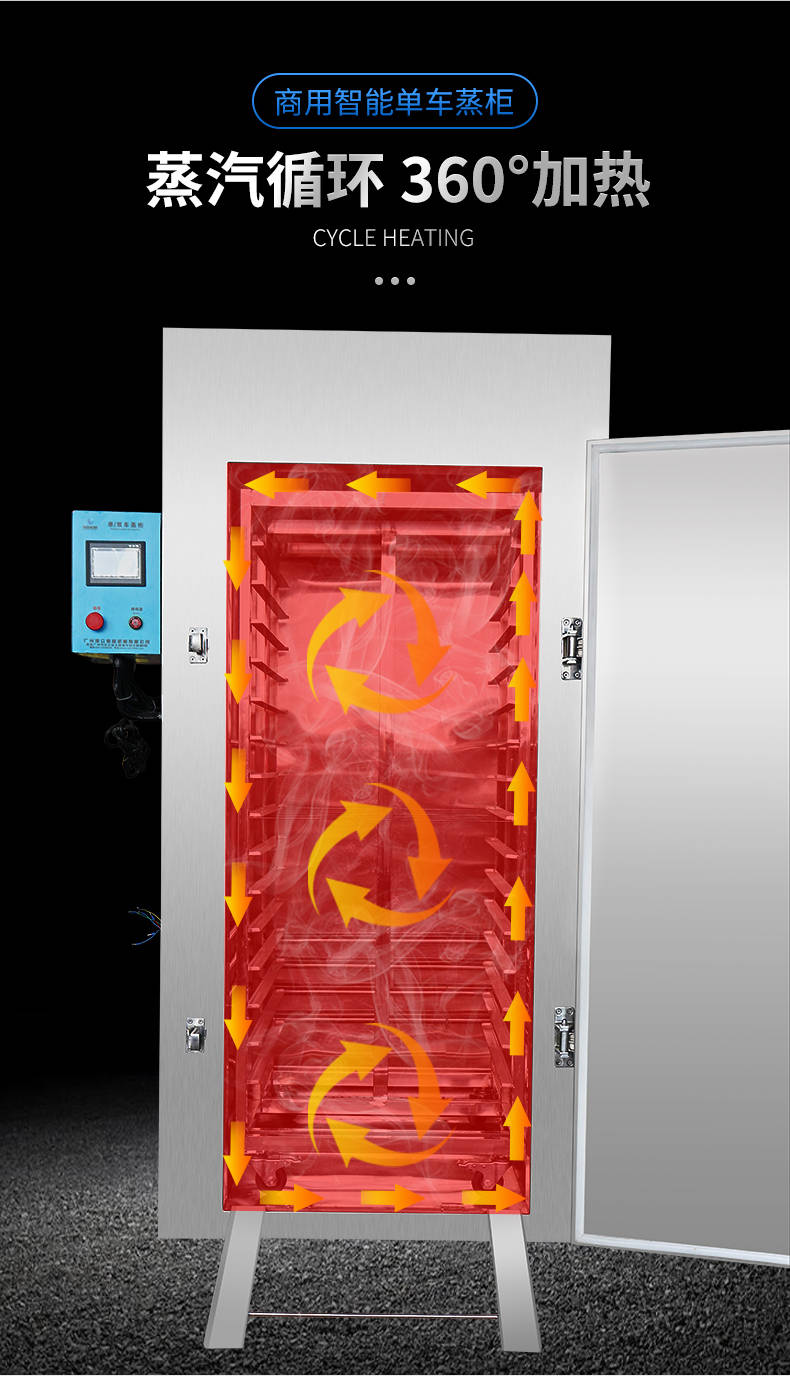 单车蒸柜,整机不锈钢材质本机由内胆壳、保温层、外护板组成,整机采用优质不锈钢,加上硅胶密封及硅酸铝保温材料,坚固、耐用、保温效果好,外形美观。循环均匀发热,专门用于发热管干烧空气,温度任意调节,让食物口感怡到好吃