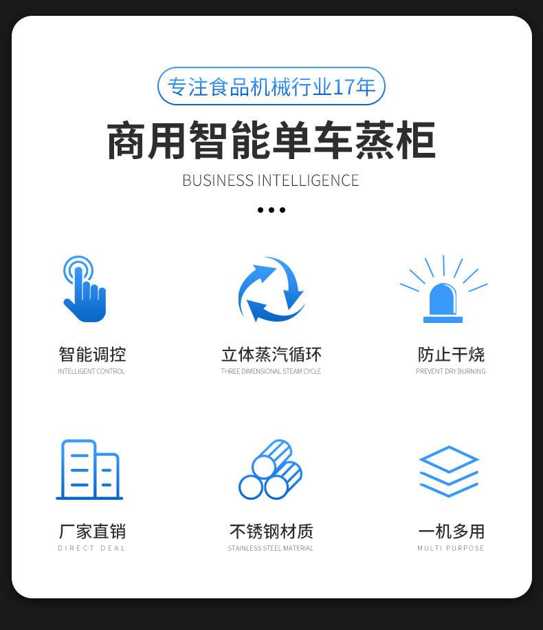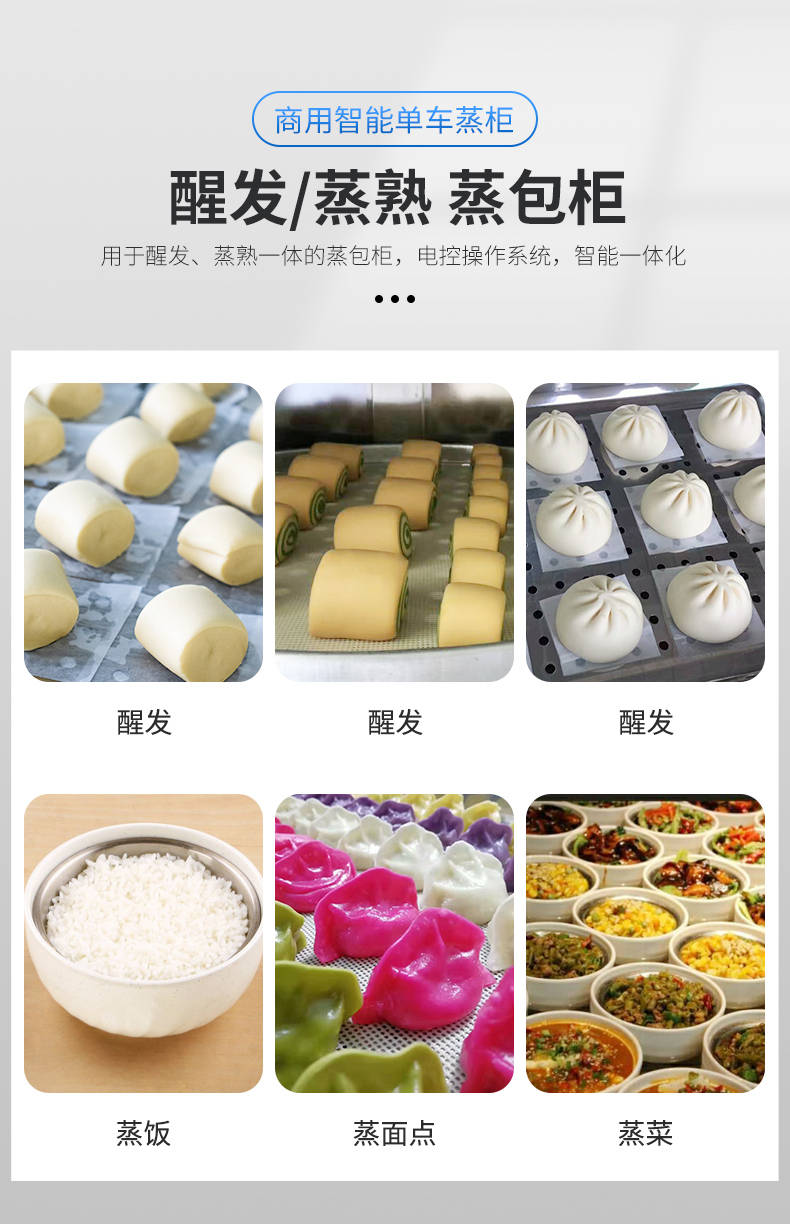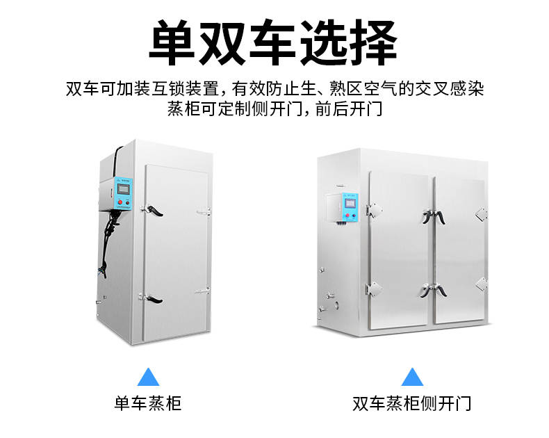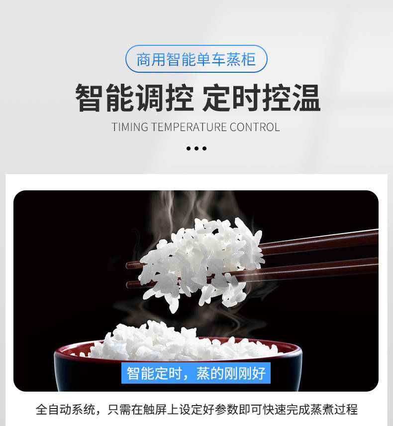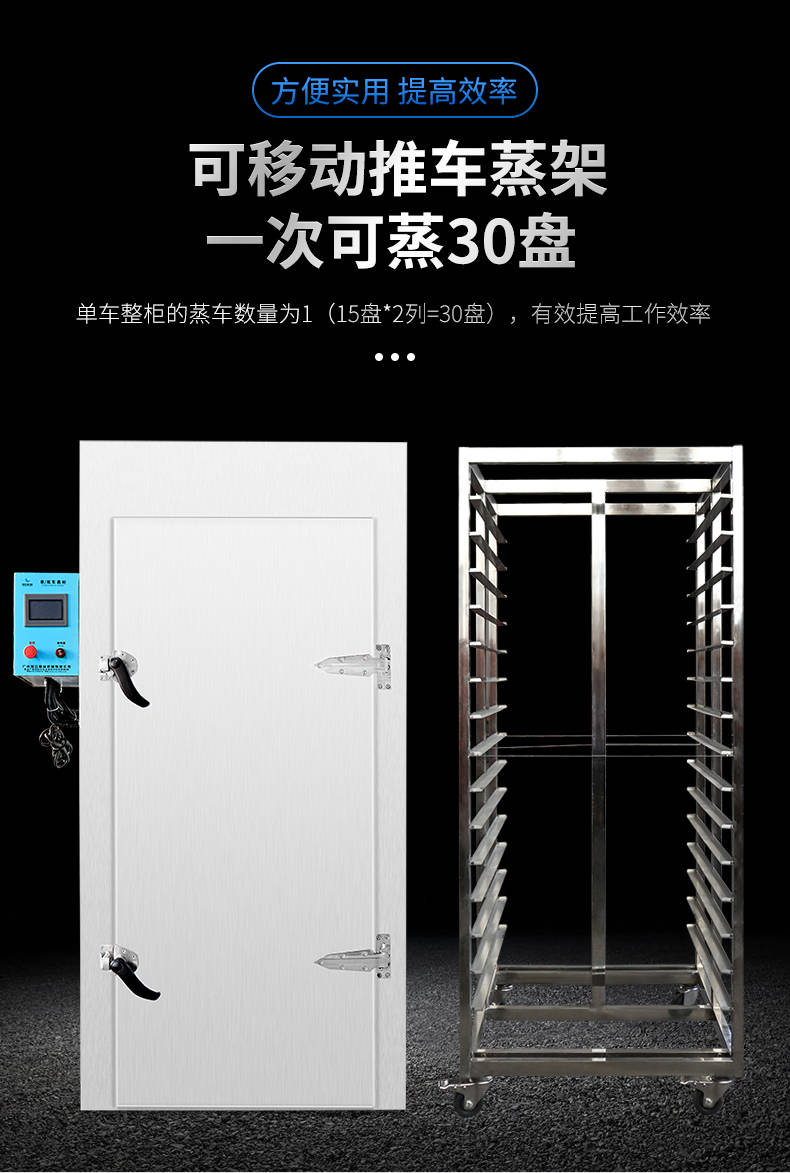 单车蒸柜,整机不锈钢材质本机由内胆壳、保温层、外护板组成,整机采用优质不锈钢,加上硅胶密封及硅酸铝保温材料,坚固、耐用、保温效果好,外形美观。循环均匀发热,专门用于发热管干烧空气,温度任意调节,让食物口感怡到好吃
